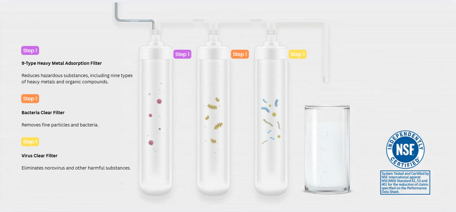 This water filter effectively reduces nine types of heavy metals as well as norovirus. In addition, this filter has also received NSF/ANSI 42, 53, and 401 certification from the National Sanitation Foundation (NSF).