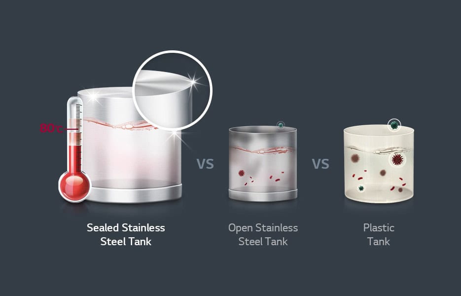 Hot water is filtered and stored in a sealed stainless steel tank to eliminate airborne contaminants.
